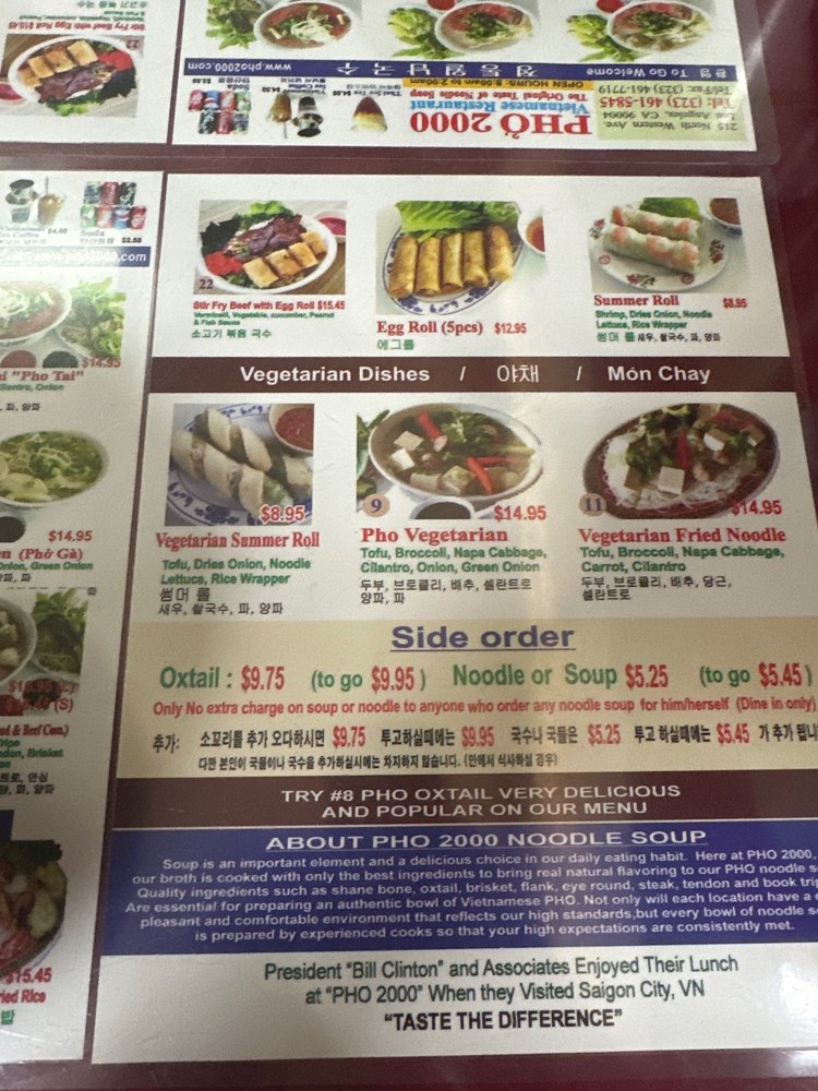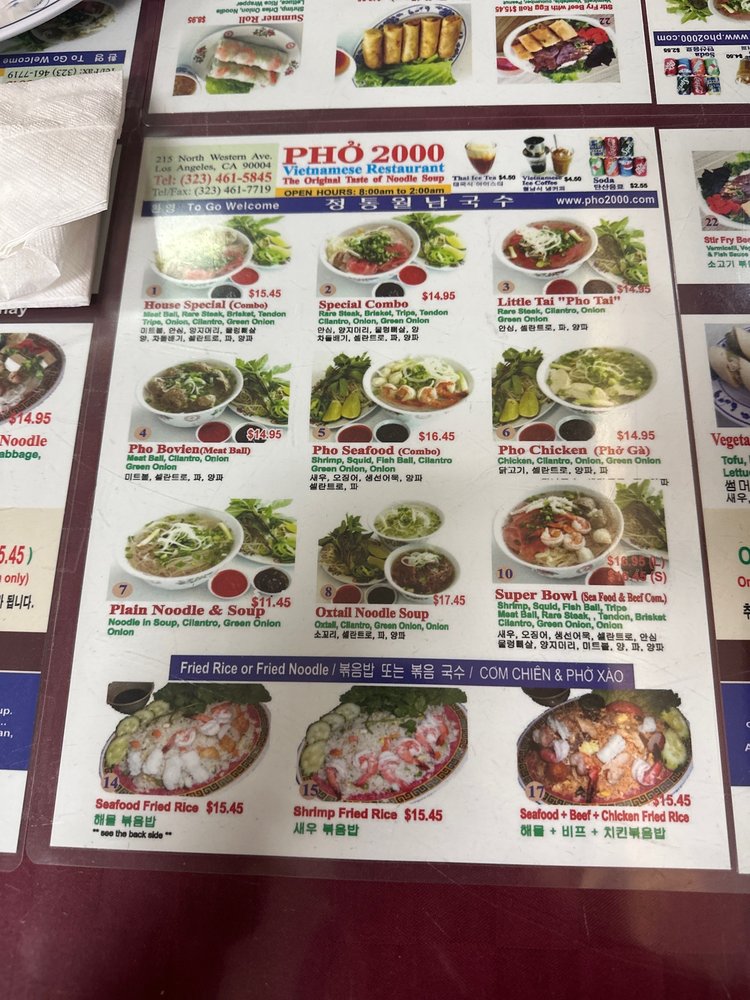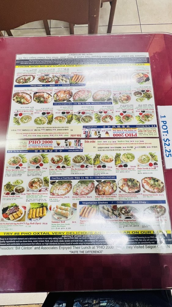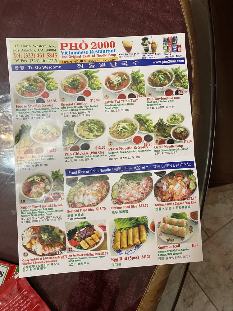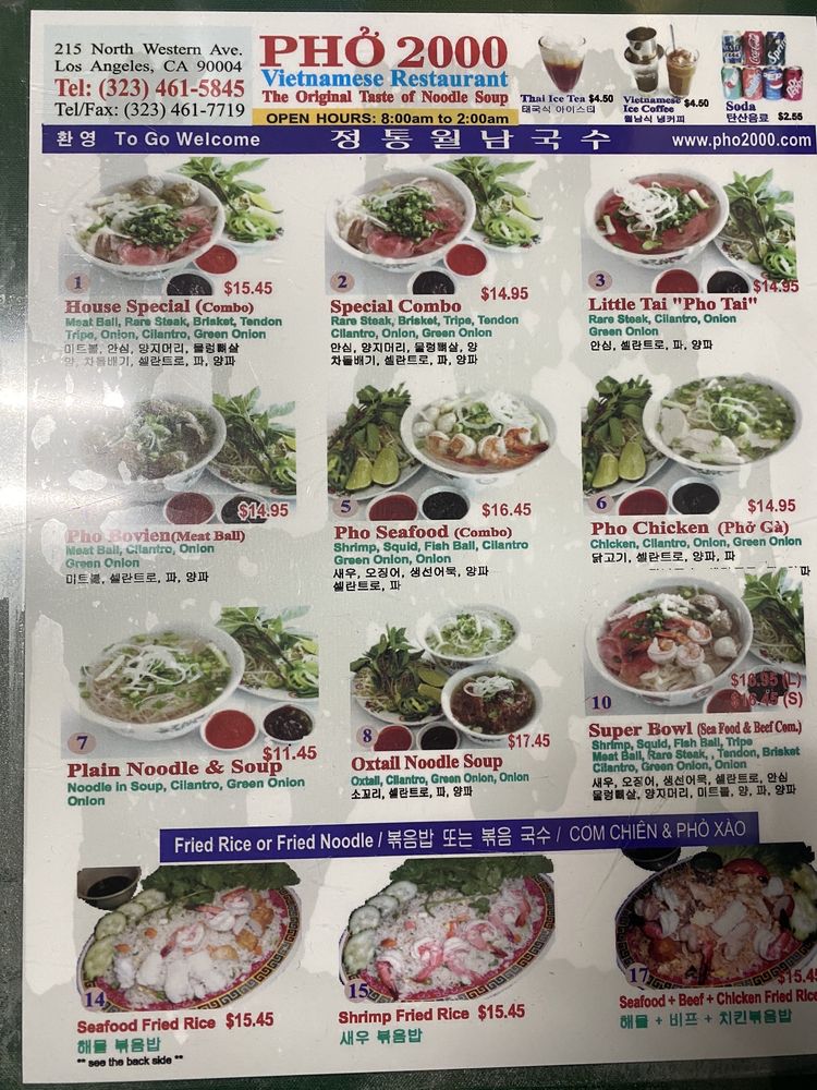 Pho 2000, located in Los Angeles, offers a variety of Vietnamese cuisine with options for delivery, takeout, and reservations. This casual restaurant provides vegan options, limited vegetarian choices, and accepts credit cards, Android Pay, and Apple Pay. With a cozy ambiance and good for groups and kids, Pho 2000 also features outdoor seating, catering services, and a happy hour. The menu includes delicious appetizers like Egg Rolls and Spring Rolls, along with a selection of pho dishes such as the Super Bowl and House Special. Customers enjoy the flavorful broth and generous toppings, making it a go-to spot for a comforting bowl of pho. The friendly staff and clean environment add to the overall dining experience at Pho 2000.