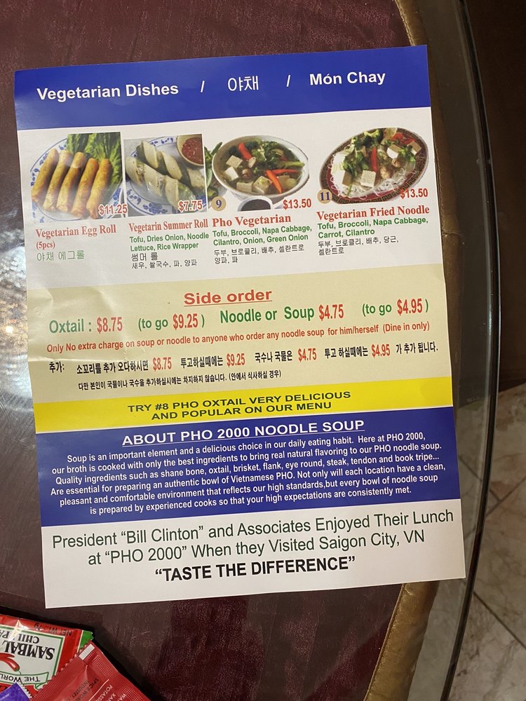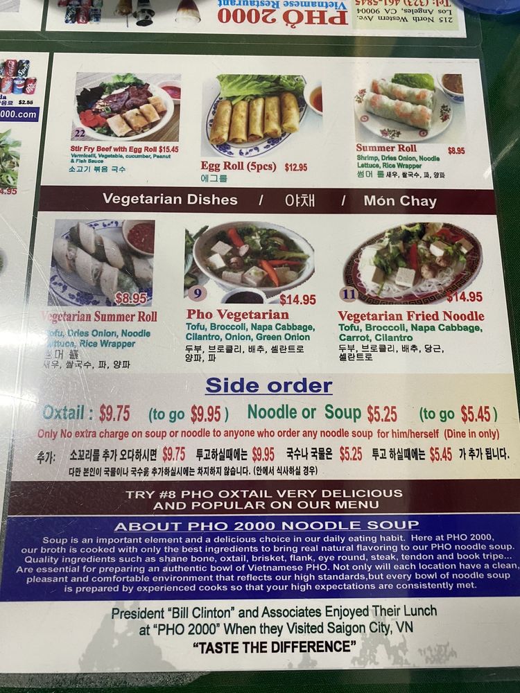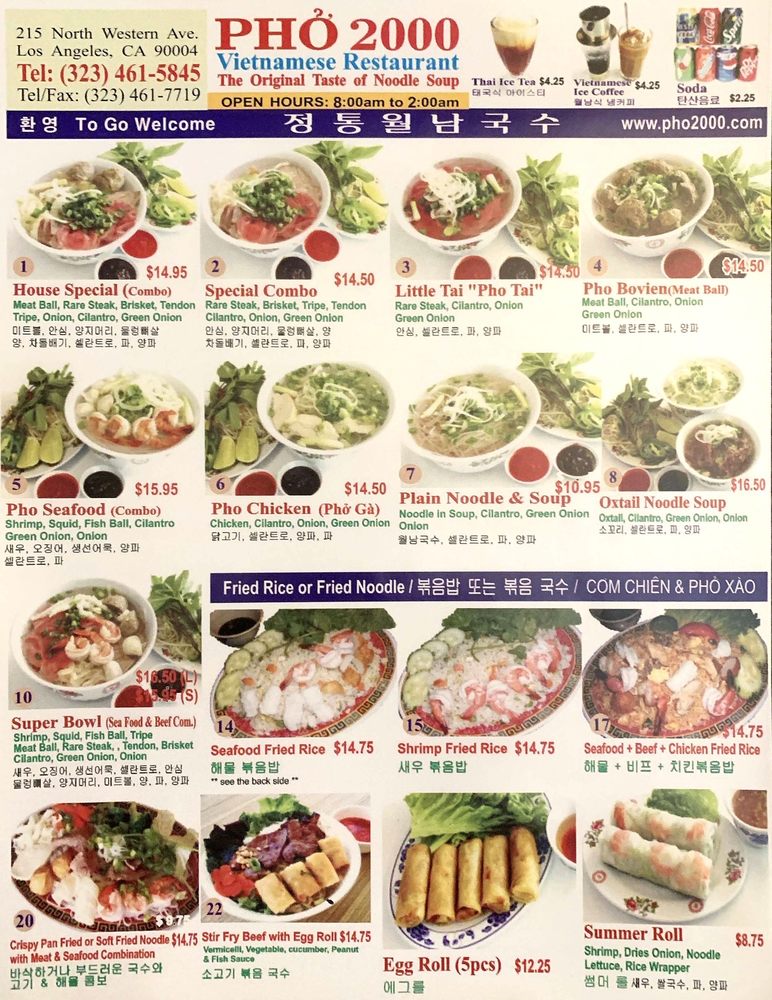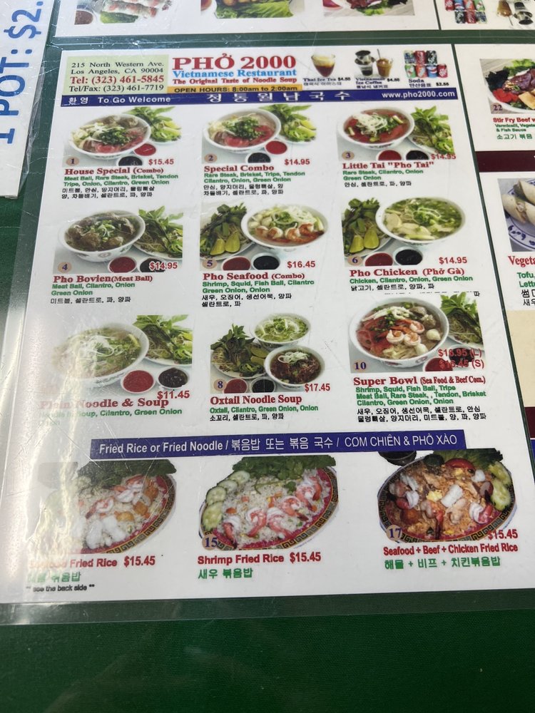 Pho 2000, located in Los Angeles, offers a variety of Vietnamese cuisine with options for delivery, takeout, and reservations. This casual restaurant provides vegan options, limited vegetarian choices, and accepts credit cards, Android Pay, and Apple Pay. With a cozy ambiance and good for groups and kids, Pho 2000 also features outdoor seating, catering services, and a happy hour. The menu includes delicious appetizers like Egg Rolls and Spring Rolls, along with a selection of pho dishes such as the Super Bowl and House Special. Customers enjoy the flavorful broth and generous toppings, making it a go-to spot for a comforting bowl of pho. The friendly staff and clean environment add to the overall dining experience at Pho 2000.